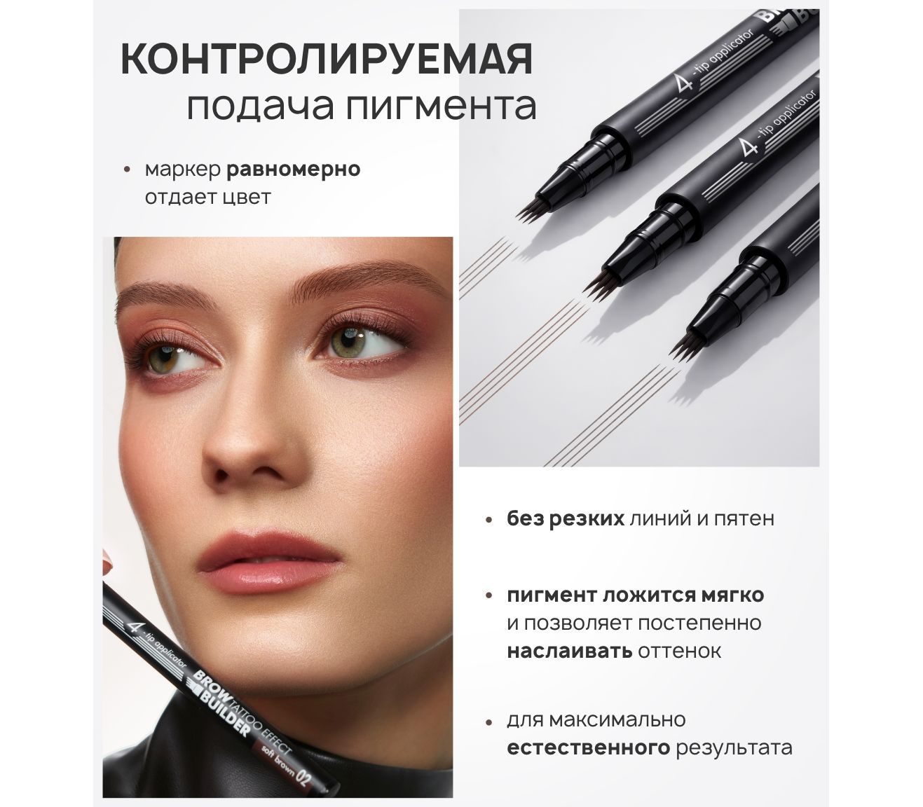 Маркер с 4-х полосным аппликатором одновременно прорисовывает до четырех ультратонких штрихов, создавая эффект микроблейдинга.